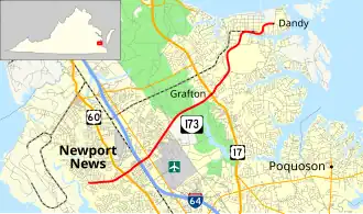 State Route 173 (SR 173) is a primary state highway in the U.S. state of Virginia. The state highway runs 10.84 miles (17.45 km) from Moyer Road in Newport News east to SR 629 in Dandy. SR 173 connects the Denbigh area of Newport News with Grafton, Seaford, and Dandy in eastern York County.
