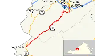 State Route 18 (SR 18) is a primary state highway in the U.S. state of Virginia. Known for most of its length as Potts Creek Road, the state highway runs 25.86 miles (41.62 km) from SR 311 in Paint Bank north to U.S. Route 60 (US 60) and US 220 in Covington.