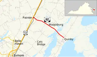 State Route 182 (SR 182) is a primary state highway in the U.S. state of Virginia. The state highway runs 3.71 miles (5.97 km) from U.S. Route 13 (US 13) in Painter east to SR 605 at Quinby in southern Accomack County.