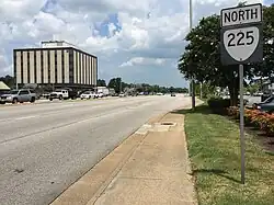SR 225 begins at a four-leg intersection with South Boulevard, which parallels I-264 east from the intersection; Baxter Road, which heads southwest toward the Kempsville area of Virginia Beach; and Independence Boulevard, which continues southeast as an eight-lane divided highway toward the city offices in the Princess Anne section of the city. The eight-lane state highway immediately encounters a cloverleaf interchange with I-264 (Virginia Beach Expressway). The ramp from eastbound I-264 to Independence Boulevard splits, with one leg passing over Baxter Road to merge with the southbound direction south of SR 225's terminus. North of I-264, SR 225 passes through the Pembroke Manor section of Virginia Beach, which serves as the city's downtown. The state highway passes Virginia Beach Town Center, a mixed-use area that features the Westin Virginia Beach Town Center, a hotel that is the tallest building in Virginia, and the Pembroke Mall. Between the two shopping destinations is SR 225's junction with US 58 (Virginia Beach Boulevard), an at-grade intersection of two eight-lane divided highways.[1][2]