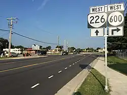 SR 226 begins at an intersection with US 460 east of Sutherland; the U.S. Highway heads west as Cox Road and southeast as Airport Street, which serves Dinwiddie County Airport on its way to junction with Interstate 85 and US 1. The state highway heads east as a two-lane undivided road that crosses over Norfolk Southern Railway's Norfolk District rail line. SR 226's surroundings gradually transition from farmland to suburban residential subdivisions and commercial strips. The state highway reaches its eastern terminus at US 1 and US 460 Business (Boydton Plank Road) a short distance west of the independent city of Petersburg.[1][2]