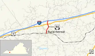 State Route 90 (SR 90) is a primary state highway in the U.S. state of Virginia. Known as Main Street, the state highway runs 1.73 miles (2.78 km) from SR 616 and SR 749 north to Interstate 81 (I-81) within Rural Retreat in western Wythe County. SR 90 connects Rural Retreat with I-81 and U.S. Route 11 (US 11).
