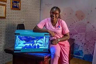 The Crib A'Glow is a portable, affordable phototherapy device made in Nigeria.[14][17] The innovation is recognized around the world and has saved 550,000 babies in more than 500 hospitals across Nigeria, Ghana, Kenya, and Benin.[15][18][16][19][20] In order to facilitate infant recovery, hospitals, health centers, and first-time mothers purchase or rent cribs.[21] COVID-19 caused a high demand for cribs, as parents wanted to avoid hospitals while caring for their newborns.[22]