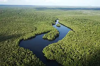 The Viruá National Park is in the Caracaraí municipality of Roraima.[2] It has an area of 241,948 hectares (597,870 acres).[3][a] The main river is the Viruá Igarapé, a blackwater river with little sediment, which flows into the Anauá River along the southern limit of the park. The Anauá in turn feeds the Branco River, which forms the western boundary of the park.[4] The Caracaraí Ecological Station and Niquiá Ecological Station lie along the opposite shore of the Branco River. The park adjoins the Baixo Rio Branco-Jauaperi Extractive Reserve to the south and the Anauá National Forest to the southeast.[5]