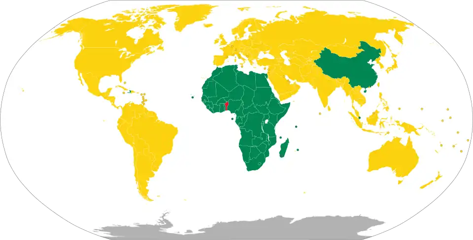 Citizens of the following countries and territories can visit Benin without a visa for the period listed below:[1][2][3]