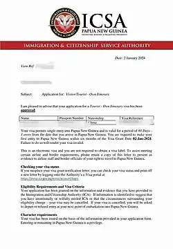 - ^ a b c d "Papua New Guinea opens Visa on Arrival (VoA) with selected countries on reciprocal basis" (PDF). ica.gov.pg. 25 September 2023. Retrieved 29 October 2023.