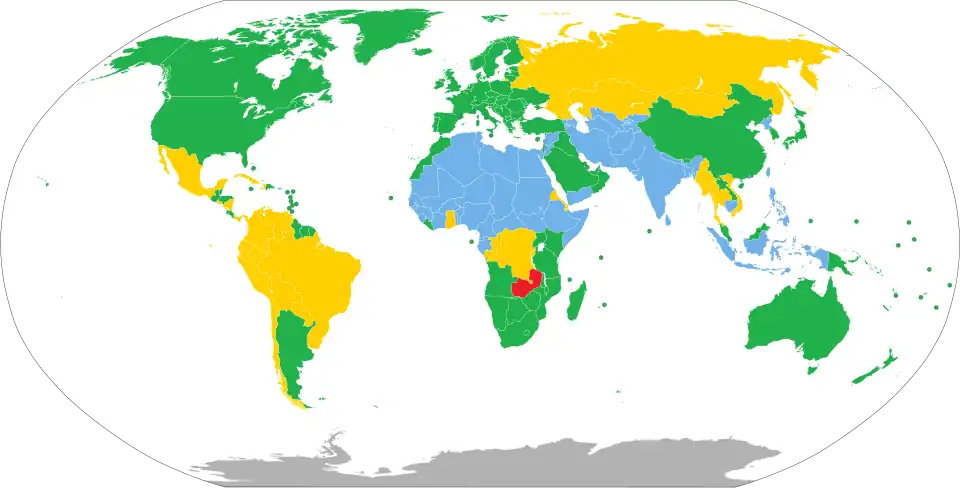 Holders of passports issued by the following countries and territories do not need a visa to enter Zambia for up to 90 days in one year as tourists or 30 days in one year for business:[3][4][5]