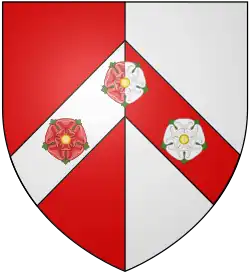 Per pale gules and argent on a chevron three roses counterchanged barbed and seeded proper