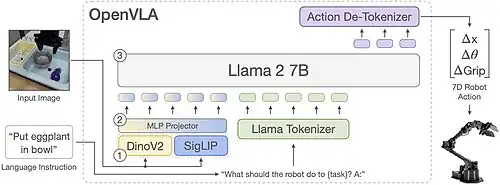 OpenVLA is a 7b-parameter open-source VLA model introduced in June 2024 by researchers at Stanford. It was trained on the Open X-Embodiment dataset, a collaboration between 21 institutions that collected over one million episodes on 22 different embodiments. The model fuses image features using DINOv2[14] and CLIP, with a Llama-2 language backbone, and outputs discrete actions tokens. Despite its smaller size with respect to Google DeepMind's RT-2, OpenVLA outperforms RT-2 on a suite of manipulation tasks. It also supports parameter-efficient fine-tuning methods and quantization for resource-constrained deployment.[7][15][16]