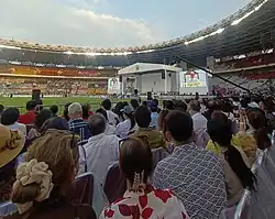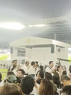 The Eucharistic Liturgy begins with the preparation of the offering, during which the offering materials are brought before Pope Francis.[104] The Preparation of the Offering is accompanied by a number of songs, including T'rimalah ya Bapa (Accept it, God) and Di Pulau Samadi (In Samadi Island) that originated from the Indonesian catholic book, the Madah Bakti, and also the song Kami Unjukkan, Kami Sembahkan (We Show, We Present) which was sung at a Mass presided over by Pope John Paul II at the same location in 1989. The Eucharistic Liturgy was presided over by Cardinal Suharyo who delivered the prefaces and the Eucharistic Prayer III in Latin, while the Lord's Prayer and the acclamations leading up to the reception of communion were chanted in Bahasa Indonesia. At the altar, Cardinal Suharyo was accompanied by KWI Chairman, Antonius Subianto Bunjamin, O.S.C. (Bishop of Bandung) and KWI First Vice Chairman, Adrianus Sunarko, O.F.M. (Bishop of Pangkalpinang). At the time of the consecration, Pope Francis stood on his chair while extending his right hand.[105] The congregation then received communion, accompanied by a number of songs including Aku Rindu Akan Tuhan (I Long for the Lord),[106] Tuhan Bentengku (Lord My Fortress), Sungguhlah Indah Rumah-Mu (How Beautiful is Thou House), and Dikau Tuhan dan Kawanku (Praise to You, Lord). The day before, a concelebrated Mass was held at the Gelora Bung Karno Main Stadium and at the Madya Stadium to consecrate the host that was given to the people at this mass.[107]