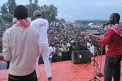 On March 25, 2009, he delivered a speech resigning as President of the National Assembly.[20][21] On 14 December 2010, Kamerhe officially quit the PPRD, announcing his candidacy for the 2011 presidential election and the creation of his new party,[22] the UNC.[23] The UNC had its official inauguration in February 2011, and Kamerhe got 7.74% of the vote in the 2011 presidential election under its name.
