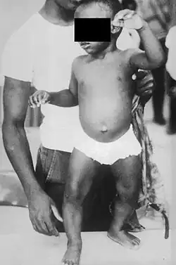 Although rickets and osteomalacia are now rare in Britain, osteomalacia outbreaks in some immigrant communities included women with seemingly adequate daylight outdoor exposure wearing typical Western clothing.[30] Having darker skin and reduced exposure to sunshine did not produce rickets unless the diet deviated from a Western omnivore pattern characterized by high intakes of meat, fish, and eggs and low intakes of high-extraction cereals.[31][32][33] In sunny countries where rickets occurs among older toddlers and children, rickets has been attributed to low dietary calcium intakes. This is characteristic of cereal-based diets with limited access to dairy products.[33] Rickets was formerly a major public health problem among the US population; in Denver, almost two-thirds of 500 children had mild rickets in the late 1920s.[34] An increase in the proportion of animal protein in the 20th-century American diet coupled with increased consumption of milk fortified with relatively small quantities of vitamin D coincided with a dramatic decline in the number of rickets cases.[35][36][37] One study of children in a hospital in Uganda, however, showed no significant difference in vitamin D levels of malnourished children compared to non-malnourished children. Because both groups were at risk due to darker skin pigmentation, both groups had vitamin D deficiency. Nutritional status did not appear to play a role in this study.[38]