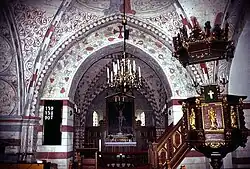 The oldest parts of the church are built in Romanesque style during the late 12th century or early 13th century. In the 15th century a chapel was built in the north. The chapel was dedicated to Saint Anne. The vaults were built in the 15th century with murals from the 1480s, showing stories from Genesis. These were later painted over, but again restored in the 20th century.