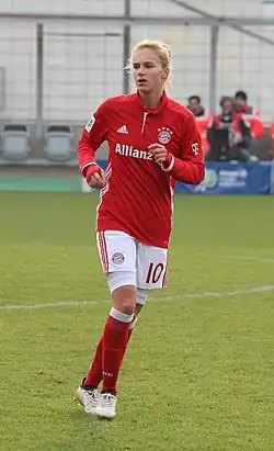 39 different clubs made inquiries about signing Miedema, before she signed a three-year contract with Bayern Munich in the top German league, the Frauen-Bundesliga, in June 2014.[17] During the 2014–15 season, she was part of a Bayern team that remained unbeaten in the Bundesliga and won the title for the first time since 1976.[18][19] Miedema scored her first league goals in Germany on 5 October 2014 in a match against MSV Duisburg, leading to Bayern's 6–0 win.[20] In the match against SGS Essen on 30 November, Miedema tore the outer band of her ankle resulting in some time away from the pitch. She re-emerged in the German league on 22 February 2015 against VfL Wolfsburg, scoring again in the following match, against Bayer Leverkusen.[13][21] Miedema finished the season with 7 goals in 17 matches.[13] She helped Bayern Munich defend the title the following season with 14 goals in 22 matches.[13]