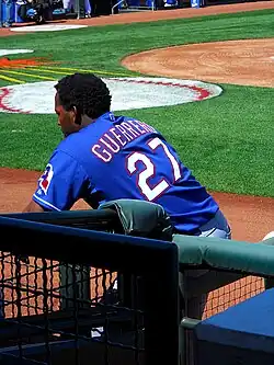 One of nine children, Guerrero is the younger brother of ex-major leaguer Wilton Guerrero of the Montreal Expos, where the two were teammates for several seasons.[10] Guerrero and his brothers played baseball using makeshift gloves assembled from milk cartons and socks filled with plastic bags as baseballs. Guerrero did not own a real baseball glove until he was 15 years old, when he received one from his older brother, a minor leaguer.[9] Guerrero's brothers, Eleazar and Julio Cesar, played in the farm systems of the Boston Red Sox and Los Angeles Dodgers, respectively.[9] Guerrero is also the cousin of minor leaguers Armando Guerrero[11] and Cristian Guerrero, and the uncle of major leaguer Gabriel Guerrero.[12]