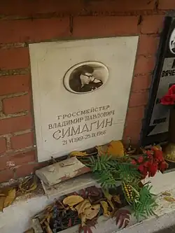 Vladimir Simagin (June 21, 1919 in Moscow – September 25, 1968 in Kislovodsk) was a Russian chess grandmaster. He was three times Moscow champion (1947, 1956, and 1959), helped to train Vasily Smyslov to the World Championship, and made many significant contributions to chess openings. He died of a heart attack while playing in the Kislovodsk tournament.