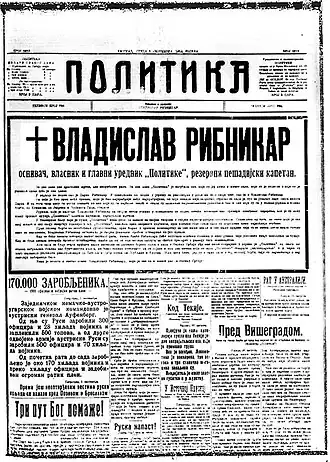 Vladislav Franc Ribnikar (Serbian Cyrillic: Владислав Франц Рибникар; 13 November 1871 – 1 September 1914) was a Serbian journalist, known for founding Politika, the oldest Serbian daily. He led the newspaper from the day it was founded in 1904 until his death in combat during the First World War.[1]