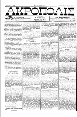 - ^ el:Βλάσης Γαβριηλίδης gives 1 November 1883 as the first issue, but el:Ακρόπολις (εφημερίδα) has 30 October.
