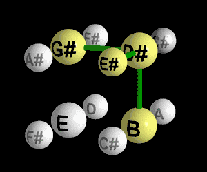 The graphical representation of Vogel's Tonnetz is limited to the three dimensions for fifths, thirds, and seventh. In this representation tones separated by one or several octaves are depicted on the same nodes. The illustration shows the chord which is the most frequent 4-note chord in western music: the dominant seventh. In Euler's Tonnetz the B-flat is constructed from fifths and thirds. In Vogel's Tonnetz it is given as a just harmonic seventh.