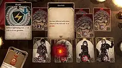 Battles play out through both scripted and random encounters with a party of four controlled by the player; protagonists Barren and Laty, and two other characters dictated by the storyline.[1][2] During combat, the player can perform standard attacks, use items, and perform skills using gems generated once per turn and added to a pool. Some skill effects are dictated by rolling a dice. Alongside single-character skills, characters with strong bonds can perform high-cost Link Skills. During some battles, happenstance cards are triggered, granting an effect to both the player and the enemy party. Damage from attacks is calculated using the attack and defense values on each card, while each character can only have one positive and one negative status effect at a time. Upon winning, the party is awarded with gold and experience points, with leveling up raising a character's health and attributes.[2][5]
