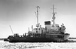 While the new icebreaker was being built, the state-owned icebreaker fleet had become a powerful strike weapon for Niilo Wälläri, the chairman of the Finnish Seamen's Union. By the early 1950s, the strikes had become so common that they were sometimes considered a normal part of the arrival of winter. It was even jokingly said that a new icebreaker strike could be predicted simply by looking at the thermometer—the "strike threshold" would be reached when the temperature dropped low enough for the seas to freeze.[7] When Wälläri announced a new strike in 1953, the Finnish Government decided to take action as the icebreaker strikes effectively stopped all foreign trade during the winter months, causing major losses for the Finnish industry. In Sweden, the state-owned icebreakers were part of the Swedish Navy and thus were not allowed to go on strike. On 9 February 1954, only four days before Voima was commissioned, it was decided to move the new icebreaker under the Finnish Navy, where it would replace the 77-year-old Von Döbeln as the supply ship for the torpedo boats during the summer months. During the icebreaking season, the ship would still be crewed by the Navy, but used to escort merchant ships under the command of the Finnish Maritime Administration.[3][8]