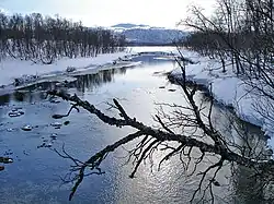 Vojmån is a river that runs through southern Lapland, Sweden, from the Norwegian border south of Skalmodal to Lake Volgsjön, where it flows into Vilhelmina. Volgsjön is in turn drained by the Ångermanälven river. Vojmån is 225 km[1] long including source streams and passes the lakes Aujojaure, Bleriken, Gottern, Fiansjön, Fättjarn, Borkasjön and Vojmsjön. The catchment area is 3 543 km2. Along the Vojmån, Kittelfjäll and Dikanäs are located.