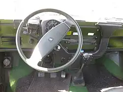 The engine has a low 8.2: 1 compression ratio, allowing it to run on low-octane gasoline. The four-wheel drive is engaged by a lever on the floor, as are the optional differential locks. The car has rack-and-pinion steering and many suspension parts are the same at all four corners.[5] The interior is minimal, although the seats, from the contemporary Volkswagen Passat, were considered surprisingly comfortable by period observers. The tiny back seat has two individually folding seatbacks, but can be considered mainly an occasional seat.[5]
