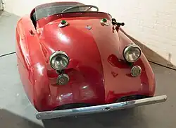 Belmondo developed the vehicle called Volugrafo Bimbo 46, in November 1945 and produced from spring 1946. Production ended in 1948 after about 60 were made. The vehicle had a tubular frame and a narrow track of only 78 cm. The fully encased front wheels were guided on double wishbones of equal length, and steering from the large steering wheel positioned slightly left of the centre was transmitted by a chain. The open, doorless body contained a bench on which two people could sit next to each other in an emergency. The vehicle was 2.4 meters long and 90 centimeters high. There was a thin fabric top without side panels as weather protection. It was powered by an air-cooled single-cylinder 125cc engine of 5 HP (3.7 kW) driving the left rear wheel. There was also a sports version equipped with a second drive set on the right rear wheel.[1]