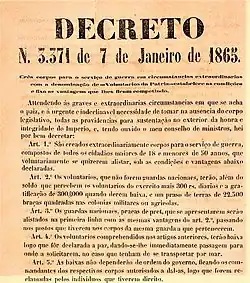 Deprived of war resources, without a sufficiently numerous and trained army and unable to adequately retaliate for the Paraguayan offense received after the invasion of Mato Grosso in December 1864 (before formal declaration of war, which happened on 13 December 1864), emperor Pedro II issued the Decree No. 3,371 on 7 January 1865;[4] This decree, appealing to the patriotic feelings of the Brazilian people, created military corps for the service of war, with the denomination of Voluntários da Pátria.[4]