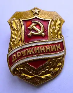 Druzhinas mostly operated in urban neighborhoods. Druzhinniks were distinguished by red armbands with the text "ДНД" (DND) or "дружинник" (druzhynnyk) on them.