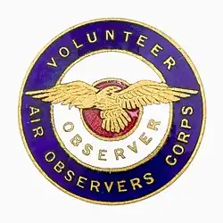 The VAOC operated under the command of the RAAF as an auxiliary arm but unlike the Royal Observer Corps in Britain members of Australia's Volunteer Air Observer Corp were not required to wear a uniform. They only received a blue armband and later a small blue lapel pin for identification. Also, responsibilities for keeping records of volunteer service rested with the VAOC and not the RAAF and as a result the records were patchy.[2] This oversight had ramifications after the war for volunteers seeking recognition of their efforts.