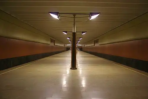 The station is the first in Moscow to be built to a new design known as a single deck. In such a case the ceiling plate is made of individual long concrete slabs that are used for automobile bridges and they are lowered on the strengthened walls of the station. Moreover, this space automatically includes the vestibules and other construction details allowing more efficient and economical approach. The architect V.Volovich took the extra space offered by the high ceiling and revetted the walls with enameled aluminium consisting of a pale yellow colour high up and red lower down. The floor is covered with grey granite. Innovative design also came for the lighting which consists of centrally mounted poles with square floodlamps on either side. Also unique are two yellow booths which contain benches for passengers to sit on.