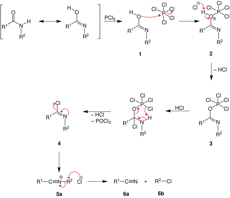 The secondary amide 1 reacts via its enolized form with phosphorus pentachloride to form the oxonium ion 2. This produces a chloride ion which deprotonates the oxonium ion to form and imine 3 and hydrogen chloride. These then react with one another to form an amine, with loss of the phosphorus chloride residue. The β-chloroimine 4 is unstable and undergoes internal elimination to a form a nitrilium cation 5 which is cleaved by attack by chloride to form a nitrile 6a and a haloalkane 6b.