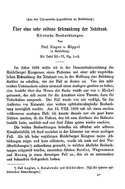 - ^ Von Hippel E (1904). "Ueber eine sehr seltene Erkrankung der Netzhaut". Albrecht von Graefe's Archiv für Ophthalmologie. 59: 83–106. doi:10.1007/bf01994821. S2CID 22425158.