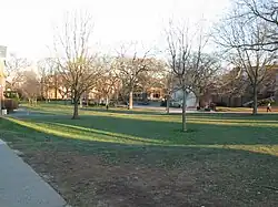 Voorhees Mall is a large grassy area with stately shade trees on a block (sometimes known as "Voorhees Campus") of about 28 acres (0.11 km2) located on the College Avenue Campus of Rutgers University near downtown New Brunswick, New Jersey. An eclectic mix of architectural styles, Voorhees Mall is lined by many historic academic buildings. The block is bound by Hamilton Street (to the east), George Street (north), College Avenue (south) and Seminary Place (west). At the mall's western end, across Seminary Place, is the campus of the New Brunswick Theological Seminary, whose history is intertwined with the early history of Rutgers University. Across Hamilton Street is the block called Old Queens, the seat of the university.