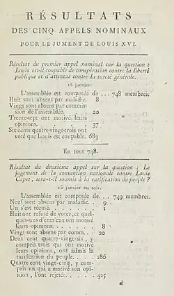 A series of votes were held at the end of the trial of Louis XVI to determine his guilt and the appropriate punishment. After voting on two initial questions on Tuesday 15 January 1793, the députés considered sentencing over 37 uninterrupted hours of debate on Wednesday 16 and Thursday 17 January. Pierre Victurnien Vergniaud was president during these sessions.[1][2]