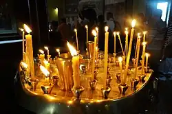 A votive candle or prayer candle is a small candle, typically white or beeswax yellow, intended to be burnt as a votive offering in an act of Christian prayer, especially within the Anglican, Lutheran, and Roman Catholic Christian denominations, among others.[1][2][3][4] In Christianity, votive candles are commonplace in many churches, as well as home altars, and symbolize the "prayers the worshipper is offering for him or herself, or for other people."[5][3][4] The size of a votive candle is often two inches tall by one and a half inches diameter, although other votive candles can be significantly taller and wider. In other religions, such as Hinduism and Buddhism, similar offerings exist, which include diyas and butter lamps.