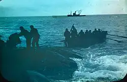 The next observation, on 29 April, showed that they had travelled 238 nautical miles (441 km; 274 mi).[36] Thereafter, navigation became, in Worsley's words, "a merry jest of guesswork",[37] as they encountered the worst of the weather. The James Caird was taking on water in heavy seas and in danger of sinking, kept afloat by continuous bailing. The temperature fell sharply, and a new danger presented itself in the accumulations of frozen spray, which threatened to capsize the boat.[38] In turns, they had to crawl out on to the pitching deck with an axe and chip away the ice from deck and rigging.[34] For 48 hours they were stopped, held by a sea anchor, until the wind dropped sufficiently for them to raise sail and proceed. Despite their travails, Worsley's third observation, on 4 May, put them only 250 nautical miles (460 km; 290 mi) from South Georgia.[39]