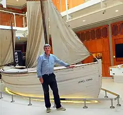 In 1967, thanks to a pupil at Dulwich College, Howard Hope, who was dismayed at the state of the boat, it was given to the care of the National Maritime Museum, and underwent restoration. It was then displayed by the museum until 1985, when it was returned to Dulwich College and placed in a new location in the North Cloister, on a bed of stones gathered from South Georgia and Aberystwyth.[57] This site has become the James Caird's permanent home, although the boat is sometimes lent to major exhibitions and has taken part in the London Boat Show and in events at Greenwich, Portsmouth, and Falmouth. It has travelled overseas to be exhibited in Washington, D.C., New York, Sydney, Australia, Wellington (Te Papa) New Zealand and Bonn, Germany.[55]