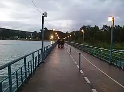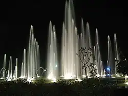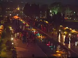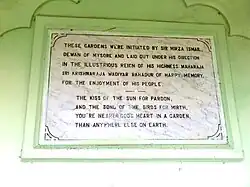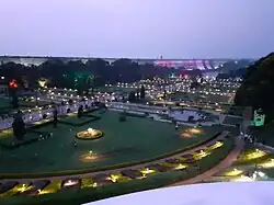 The Brindavan Gardens is a garden located 12 k.ms from the city of Mysore[1] in the Mandya District of the Indian State of Karnataka. It lies adjoining the Krishnarajasagara Dam which is built across the river Kaveri.[2] The work on laying out this garden was started in the year 1927 and completed in 1932.[3][4] Visited by close to 2 million tourists per year, the garden is one of the major attractions of Srirangapatna.[5] Sir Mirza Ismail, the Deewan of Mysore, a man with a penchant for gardens, founded the Brindavan Gardens (Krishnaraja Sagar Dam in particular) and built the Cauvery River high-level canal to irrigate 120,000 acres (490 km2) in modern Mandya district. The gardens were designed by German botanist and landscape designer Gustav Hermann Krumbiegel.