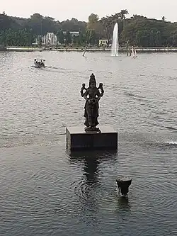 The garden is maintained by the Cauvery Niravari Nigama (Cauvery Irrigation Corporation), a Government of Karnataka enterprise.[6] It is spread across an area of 60 acres (240,000 m2). Adjoining it is also a fruit orchard spread across 75 acres (300,000 m2) and 2 horticultural farms, Nagavana (30 acres) and Chandravana (5 acres).[7] The garden is laid out in 3 terraces which contain water fountains, Ficus trees, foliage plants such as Duranta plumaria and Euphorbia and flowering plants like Celosia, Marigold and bougainvillea.[4] The garden is open to the public and an entry-fee is charged. The garden also has topiary works (sculptures of animals created by clipping shrubs), pergolas (shaded passageway covered by creepers) and gazebos.[4] The main attraction of the park is the musical fountain in which bursts of water are synchronised to the music of songs. There is also a lake within the garden with boating facilities available for visitors.[8]