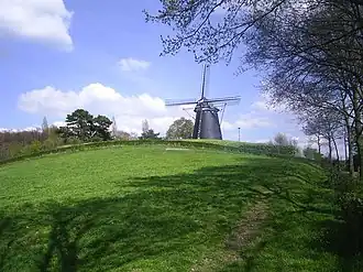 On the Vrouwenheide are several national monuments. Windmill Op de Vrouweheide, built in 1858, is located at 216 meters above Amsterdam Ordnance Datum, and built on an artificial hill to catch even more wind. As such it is the highest windmill in the Netherlands.[4][5] The Bernardushoeve is a farmhouse built in the early 19th century and currently a restaurant.[6][7] In the forest on the Vrouwenheide the remains of an old watchtower can be found.[8]