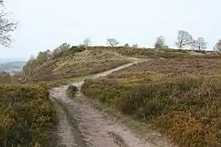 In the early 1930s, at the suggestion of C. F. C. Hawkes, Varley turned his attention to the hillforts of Cheshire.[11][25] His excavation of Maiden Castle on Bickerton Hill was his first on a hillfort,[26] and the first to be carried out by an archaeologist on any hillfort in the county.[27][nb 5] He started to excavate in 1932, aided by a group of his students from the University of Liverpool, but the main excavations of 1934 and 1935, supervised by Varley with J. P. Droop, were carried out under the "Bickerton Camp Scheme", which recruited an assortment of volunteers including unemployed Liverpudlians, school children and members of the Liverpool Ramblers' Association.[11][28] The investigation concentrated on the hillfort's inturned entrance, where post-holes were found, suggested to be gateposts. Trenches were also cut through the double ramparts. The inner ramparts were found to consist of sand and carbonised oak timbers protected by a stone cap and revetments (retaining walls), which Varley compared with the murus gallicus method of construction, typical of Gaul. An outer revetment protected the outer ramparts, which had an internal line of turf, suggesting the possibility of multiple phases of construction. Varley described Maiden Castle as a promontory camp; he initially concluded that it dated from around 0–50 AD and had subsequently been strengthened in around 50 AD when Roman expansion began to threaten the area. By 1940, he had revised these dates substantially earlier, concluding that the hillfort was built in the 2nd century BC and had been strengthened in the 1st century BC;[28][29] modern radiocarbon dating moves the dates earlier still.[30] A contemporary review of his 1937 paper on the excavation describes it as "a valuable review of the problems of the life of Britain in the few centuries before the Roman conquest."[31] Modern archaeologists Richard Mason and Rachel Pope describe his reports on Maiden Castle as showing "fairly meticulous archaeological reasoning".[32]