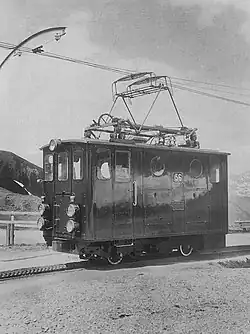 The machines with two running axles and two drive rack gears are pure rack railway locomotives. The two drive gears, for the Riggenbach-Pauli and Von Roll rack system, are not mounted on the running axles, but directly next to the running axles towards the center of the vehicle. The mechanical part comes from the Swiss Locomotive and Machine Works, abbreviated SLM, in Winterthur, the locomotives received the electrical equipment through the Elektrizitätsgesellschaft Alioth, abbreviated EGA, colloquial Alioth, in Münchenstein. For the descent, the locomotives have a self-excited electric rheostatic braking as an inertia brake, with which it is possible to make the descent with the pantograph lowered.