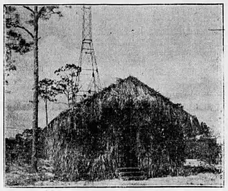 Taking advantage of the temporary lapse in government authority, in January 1927 WFLA was established as a new station, operated by Boca Raton Radio Corporation with a self-assigned wavelength of 440 meters (corresponding to choice frequency of 680 kHz) and a transmitter power of 1,000 watts.[9] Two 206-foot (62 m) steel towers were constructed 3 miles (5 km) west of the Cloister Inn, in order to support WFLA's transmission antenna. The sides and roof of a co-located studio were covered with a thatch of palmetto fronds, [10] evidence, according to one reviewer, that "no money remained to build conventional studios".[1]: 218 note 28 The station was located at the corner of Palmetto Park Road and what today is NW 4th Avenue, in Boca Raton.[11]