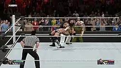 The PlayStation 4, Xbox One and Microsoft Windows versions of the game feature the same face and body scanning tech that was used for NBA 2K14 to ensure that the models look as close to their real-life counterparts as possible.[9] Textures for clothing, beards & long hair have been updated, with 2K creating an entirely new development tool to more realistically portray beards.[10] However, the PlayStation 3 and Xbox 360 versions have similar graphics to its predecessor, but with improved clothing textures and a new lighting system that lessens the shine from the superstar models.[11] The PlayStation 4 and Xbox One versions are displayed in 1080p resolution and have an improved frame rate.[12] Visual Concepts motion captured wrestlers performing their moves in an actual WWE ring over the course of forty days with the sound of each bump being recorded to ensure that it sounds like the actual move rather than using generic sounds of someone hitting the mat.[6][13] The game has five times the amount of animation data than the previous game.[6] Michael Cole and Jerry Lawler recorded new commentary, with approximately 30 hours of new commentary per commentator. The commentary was recorded with Cole and Lawler in the room at the same time to create more natural conversations and banter.[9]