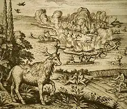 1627 illustration by Mattheüs Merian of local people hunting using fire, canoes and bows and harvesting corn on Pesamkuk (Mount Desert Island).[12]