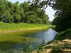 Upon entering Indiana, the river has many sharp turns; these regularly lead to log jams that can block the river. Because of the many turns in the river, during the 1830s, the state created several separate canal channels to shorten the journey between the state line and Fort Wayne as part of the Wabash and Erie Canal project. The canals were abandoned after competing railroads took over; this allowed the river to shift courses several times, resulting in the formation of many cut-offs and coves with no outlet. The river has a maze-like quality in the first seventeen-mile (27 km) stretch as it enters Indiana.[13]