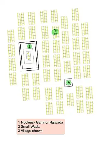 Garhis were fortified wadas with bastions and ramparts in the village's focus. The village or town grew around the Garhi with peripheral clusters of wada houses all around. They are introverted structures built in brick and stone with a series of courtyards inside. Examples are Shaniwar Wada in Pune, Holkar Wada in Chandwad, and Vafgaon.[1]