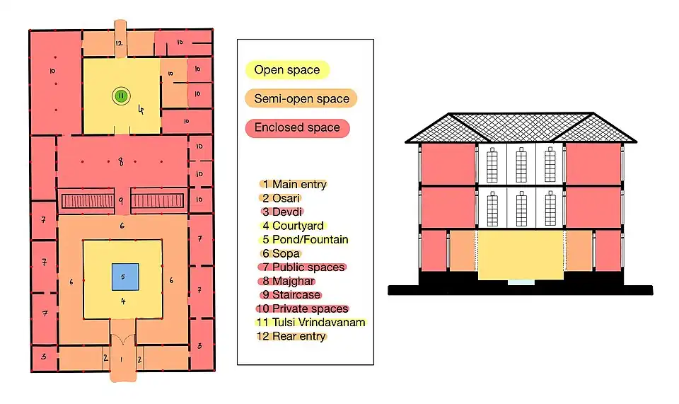 Since the wada is an introverted house, the courtyard becomes the focus of the house and is the principal organizer of all the spaces and functions oriented towards it. A definite spatial hierarchy is maintained, the thresholds of which may be physical or sensory.[1]